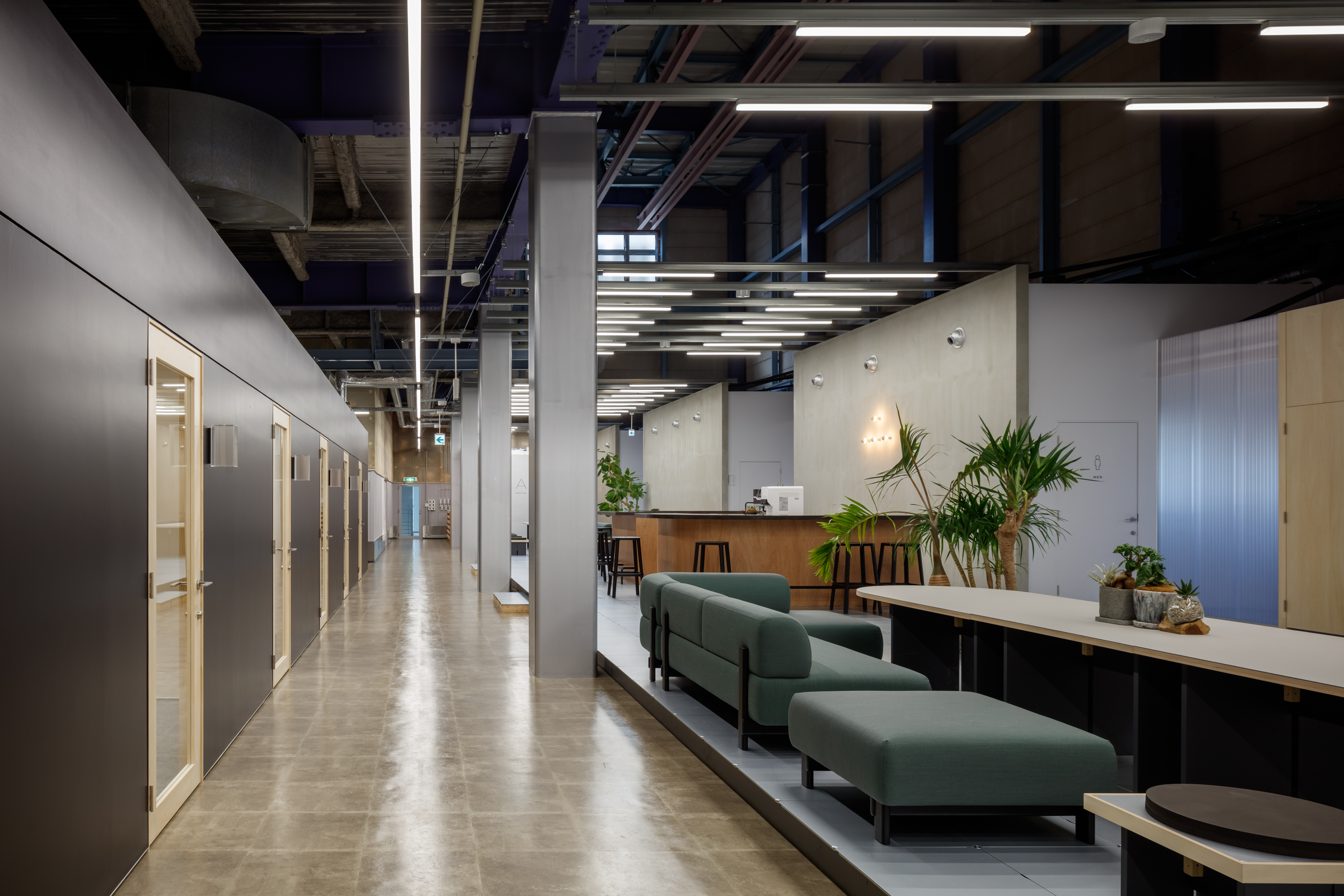 In response to an increase in the number of potential tenants, this project aims to convert a large space, 44 m wide, 13.5 m deep and with a ceiling height of 15 m, which had been left untouched, to create 17 rental office rooms, a rental conference room, booths for online meetings and a lounge with a bar counter. As in the first phase of the project, which was completed in 2019, the idea was to transform the "space for objects" into a "space for people".